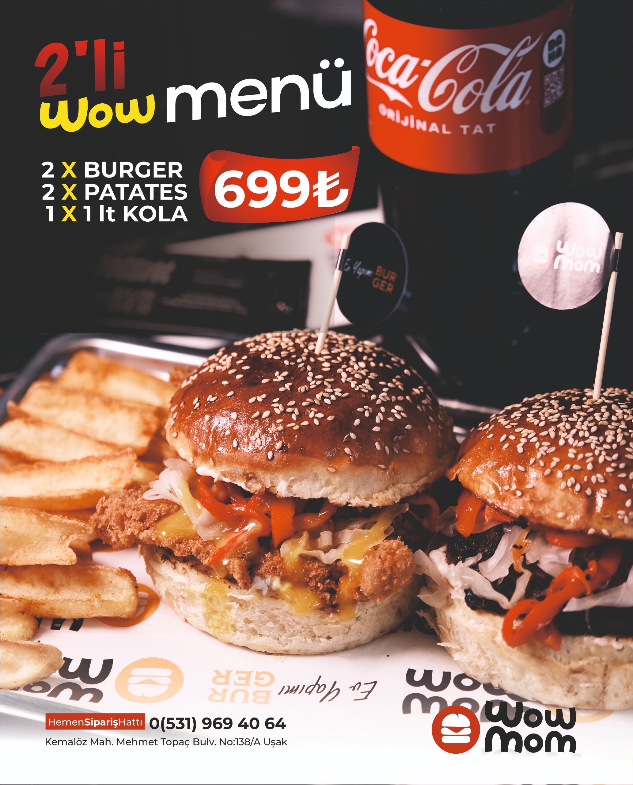 Seçeceğiniz 2 Burger + Patates + 1 Lt İçecek