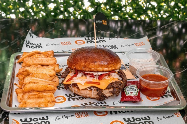 Brioche ekmeği, wow ekmek sosu, 100 gr smash köfte, cheddar peyniri, kapya biber, lahana turşusu