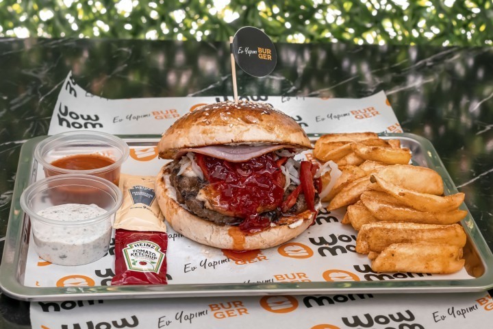 130 gr burger köftesi, wow sos, közlenmiş al biber, lahana turşusu, acı biber reçeli, isli peynir, dana füme dilim, baharatlı patates